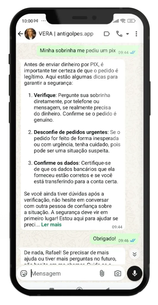 Com a VERA, você tem proteção contra golpes e orientação contra fake news.